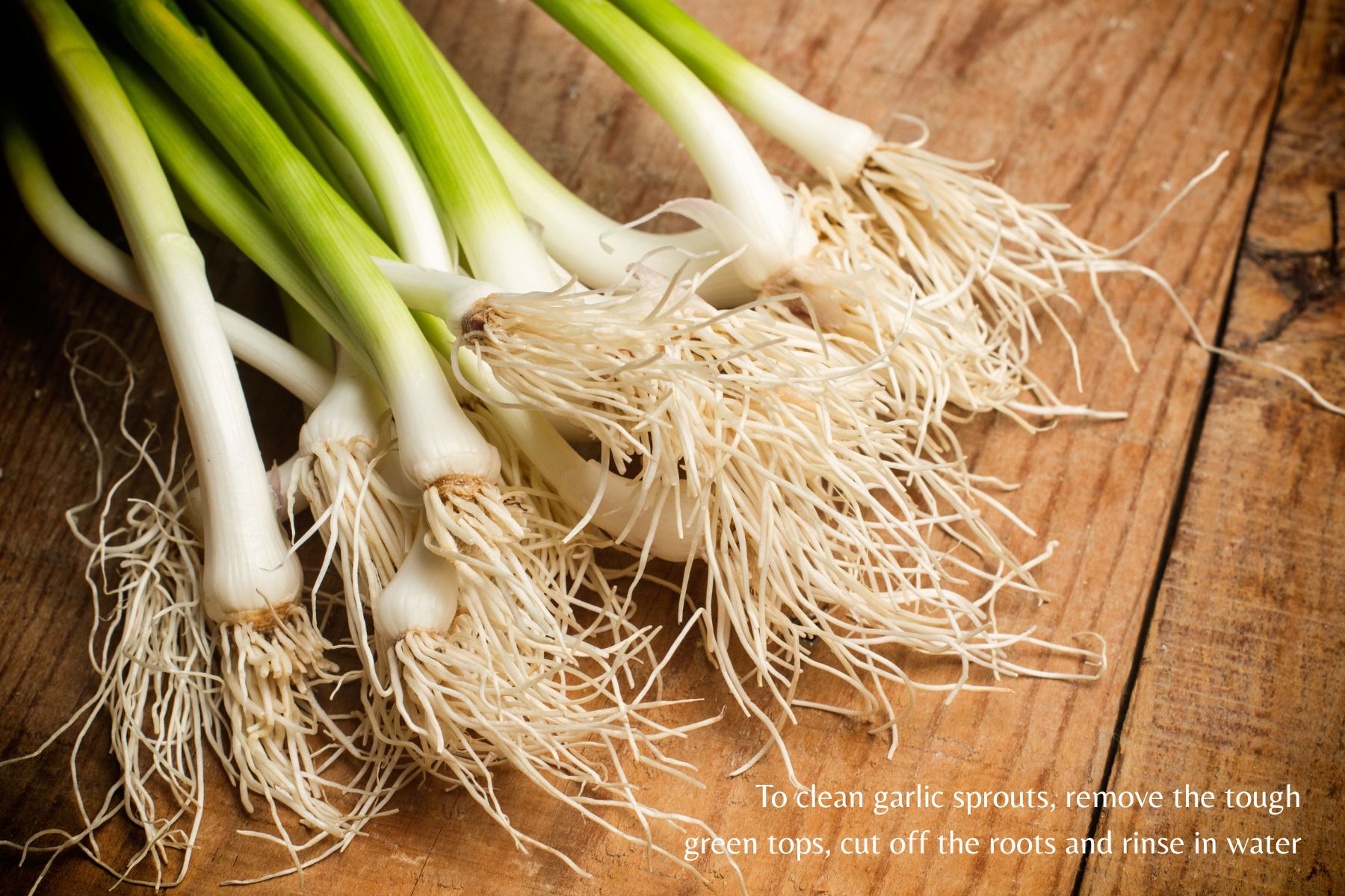 Garlic sprouts are very similar in appearance to spring onions, in that they have green leaves at the top of the sprout and the lower part is white with fine roots. However, unlike the oniony flavour of spring onions, garlic sprouts and greens have a delightful fresh, mild garlicy flavour. As a sprout the young garlic is eaten when the leaves are tender and before the bulb has started to swell. Garlic greens refer to the green leaves of the garlic sprout.